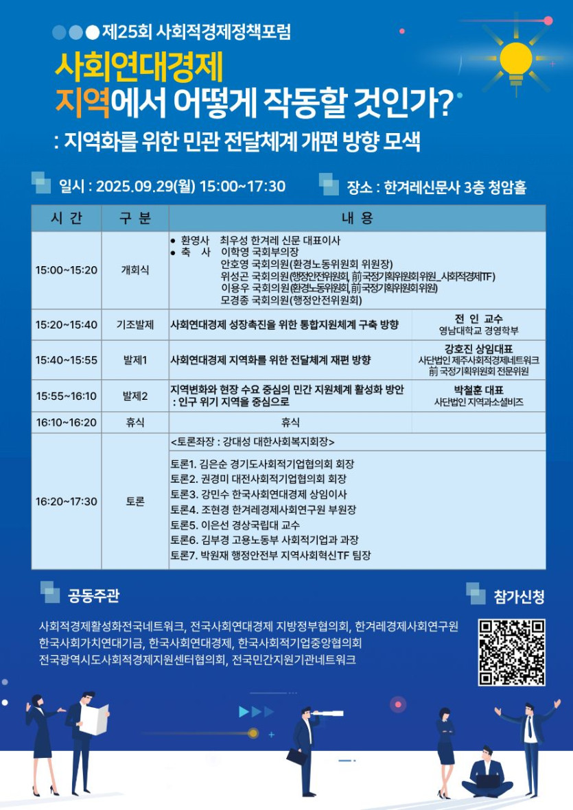 [알림] 제25회 사회적경제 정책포럼: 사회연대경제 지역에서 어떻게 작동할 것인가?: 지역화를 위한 민관 전달체계 개편 방향 모색, 9월29일(월), 한겨레신문사 청암홀