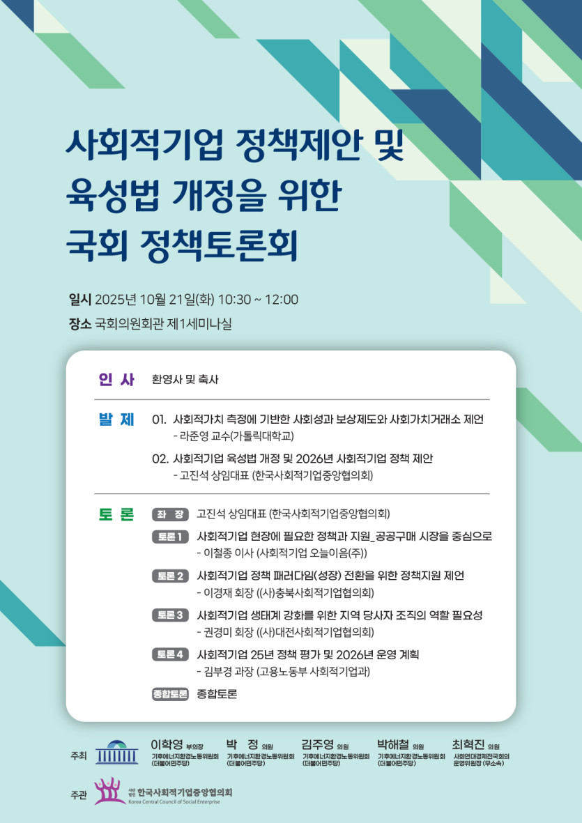 [알림] 사회적기업 정책제안 및 육성법 개정을 위한 국회 정책토론회(10/21)