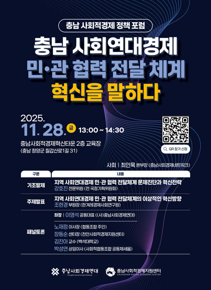 ○ 일시: 2025년 11월 28일(금) 13:00~14:30○ 장소: 충남사회적경제혁신타운 2층 교육장 (충남 청양군 칠갑산로1길31)