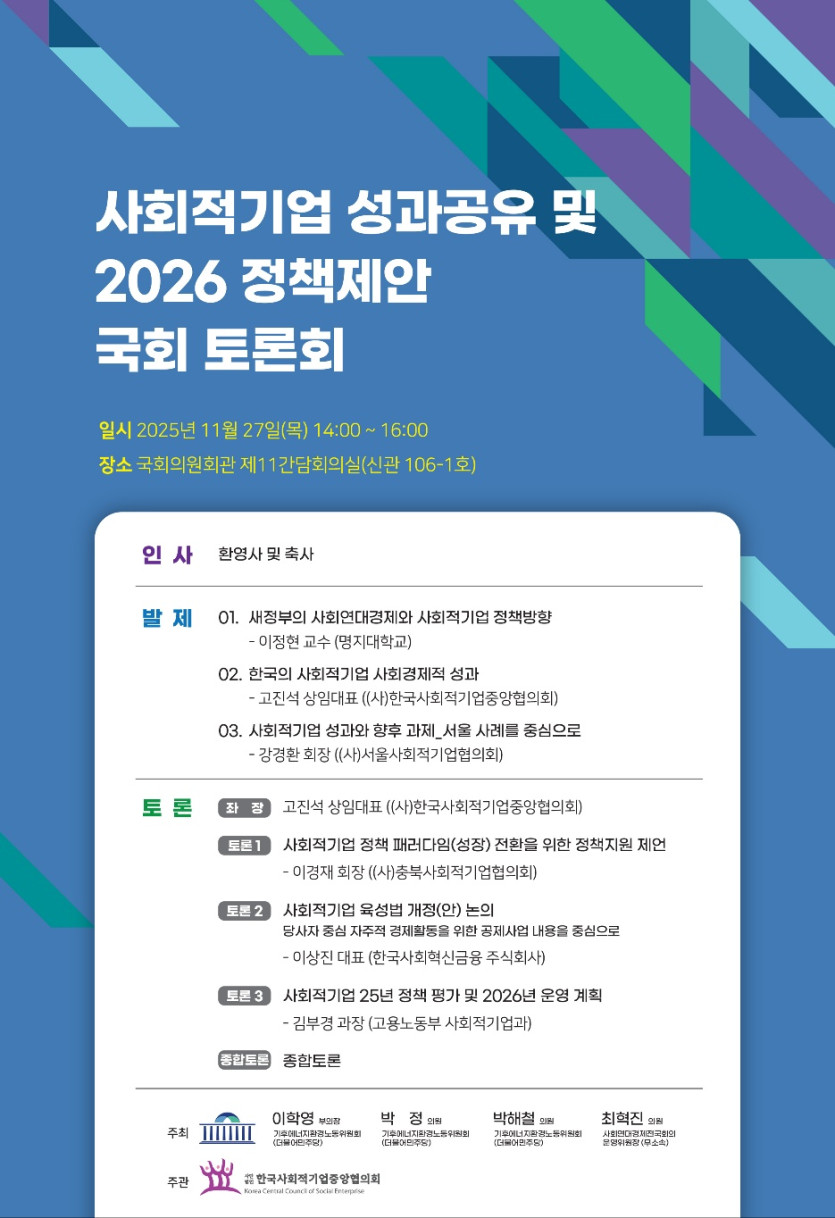 [알림] 사회적기업 성과공유 및 2026 정책제안 국회 토론회(11/27)